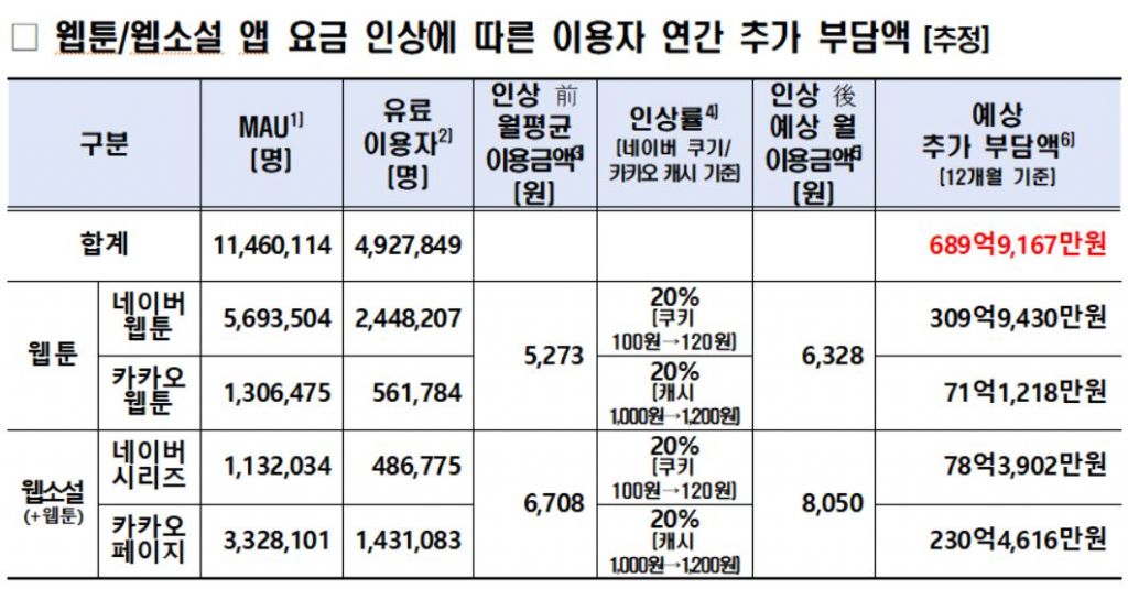 양 의원은 네이버웹툰과 카카오웹툰, 네이버시리즈, 카카오페이지의 월간활성이용자(MAU) 수에 유료결제 경험 비율을 곱해 웹툰·웹소설 유료이용자 수를 추정했다. 또 남녀 웹툰·웹소설 월평균 유료이용금액에 남녀 비율(50.9% 대 49.1%)을 적용해 '가격 인상전 월평균 이용금액'을 산출하고 여기에 20% 인상률을 적용한 '가격 인상후 이용금액'을 산출한 뒤 이들간 차액에 12개월을 곱해 연간 추가 부담액을 산출했다. 다만 이는 유료이용자들의 콘텐츠 결제가 모두 인앱결제라고 가정하고 산출한 것이다.