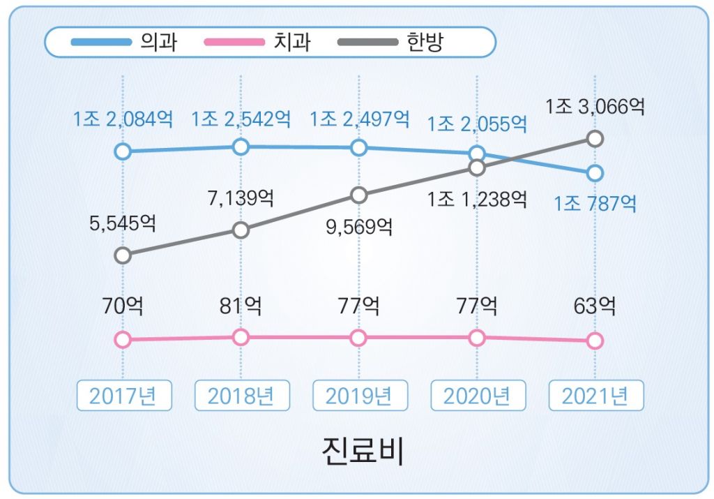 21일 건강보험심사평가원이 최근 공개한 '2021년 자동차보험 진료비통계'에 따르면, 지난해 한의과 분야 진료비는 1조3066억원으로 의과 분야(1조787억원)를 넘어섰다. 4년 전인 2017년(5545억원)과 비교하면 한의과 진료비는 두 배 이상 급증한 것이다.