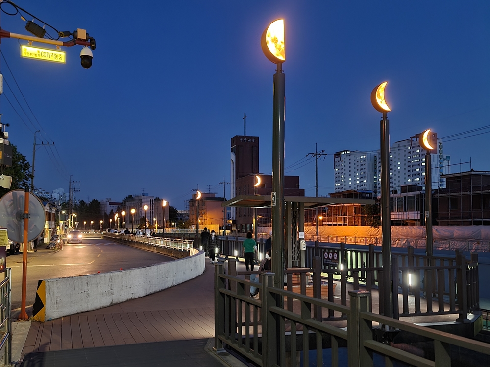 경관조명은 초승달부터 그믐달까지 다양한 모양이다. 달이 차오르고 기우는 모습을 표현해 보행자가 보는 즐거움을 느낄 수 있도록 했다. 데크길 끝에는 초승달 모양의 조명 의자 2개를 추가로 설치해 주민들이 잠시 쉬어 갈 수 있는 쉼터로 조성했다.