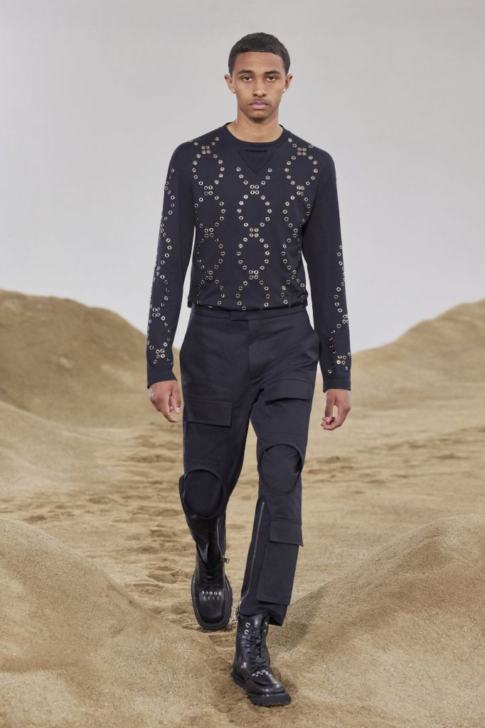 이번 컬렉션은 극한 조건과 기후 변화 속 탄생한 원단에서 영감을 얻었다. 대표적으로 열을 견디기 위해 설계된 의복에서 착안해 메쉬 레이어를 사용한 티셔츠, 니트 등이다. 색상은 베이지, 아이보리와 타는 듯한 레드와 블랙을 조화롭게 매치해 사막에 드리워진 그림자를 표현했다. 이밖에 스팽클, 포플린, 저지, 데님에 이르기까지 다양한 소재를 적용한 카고 포켓 팬츠, 스웻셔츠 등을 선보인다.