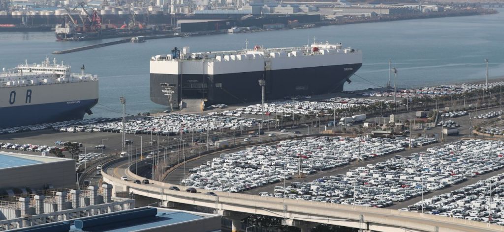 현대자동차 울산공장 수출선적부두 옆 야적장에 대기중인 완성차<이미지출처:연합뉴스>
