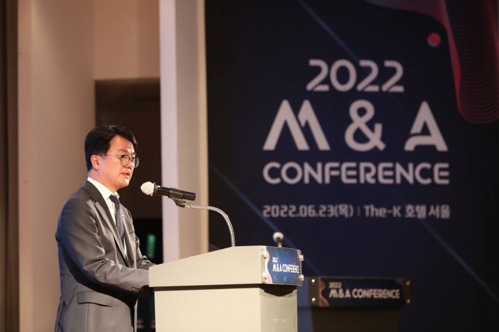 조주현 중소벤처기업부 차관이 23일 서울 양재 더케이호텔에서 열린 ‘2022 M&A 컨퍼런스’에 참석해 축사를 하고 있다.