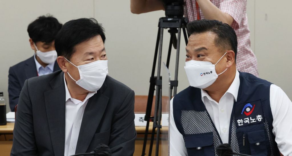 21일 오후 세종시 정부세종청사 최저임금위원회 회의실에서 열린 제5차 전원회의에서 사용자위원인 류기정 한국경영자총협회 전무(왼쪽)와 근로자위원인 이동호 한국노총 사무총장이 자리해 대화하고 있다. [이미지출처=연합뉴스]