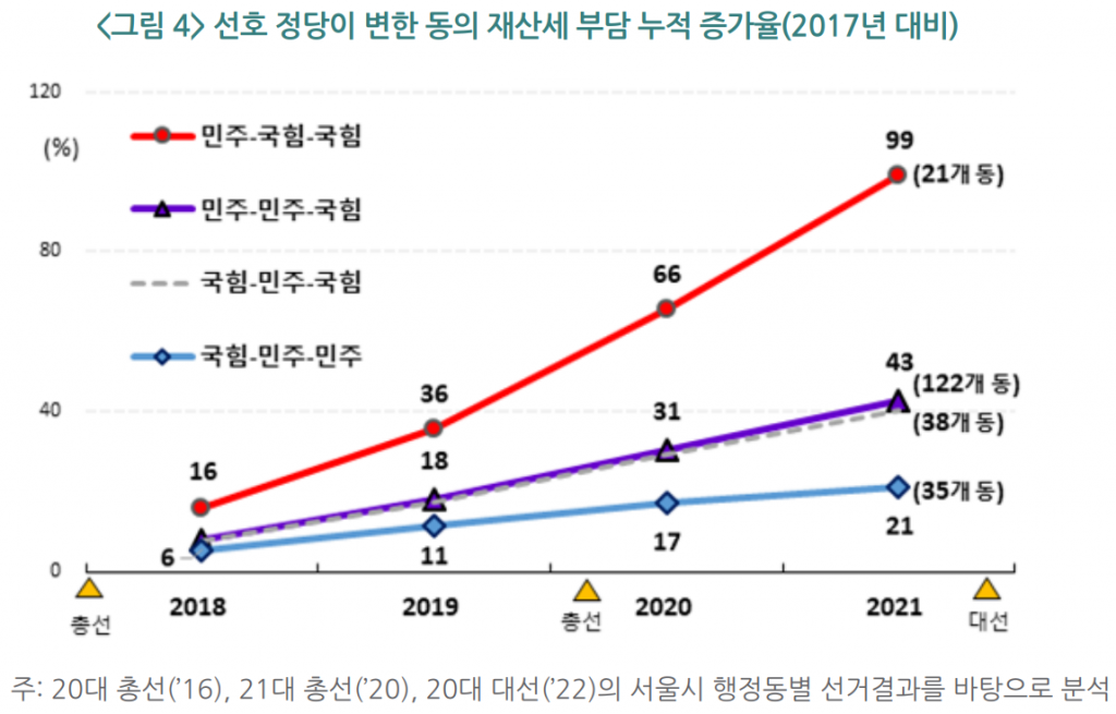 2016년 총선에서는 민주당의 선호도가 높지만, 2020년 총선부터 선호도가 변한 동의 선거 직전 재산세 부담 증가율(2017년 대비 2019년)은 평균 36%를 기록했다. 2020년 총선까지는 민주당의 선호도가 높지만, 2022년 대선에서 선호도가 변한 동의 선거 직전 재산세 부담 증가율(2017년 대비 2021년)은 평균 40~43%로 나타났다.