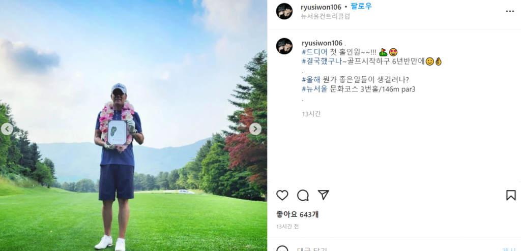 25일 류시원은 인스타그램을 통해 #드디어 첫 홀인원~~!!! #결국했구나~골프시작하구 6년반만에"라면서 "#올해 뭔가 좋은일들이 생길려나? #뉴서울 문화코스 3번홀/146m par3"라는 문구와 함께 골프를 즐기는 사진을 공개했다.
