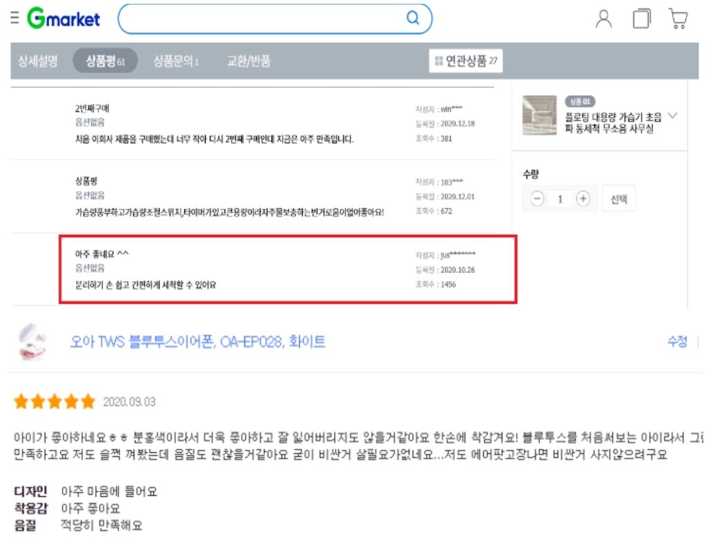 아르바이트생을 고용해 자사 제품에 대한 거짓 후기를 남기도록 지시한 소형가전업체 오아가 과징금을 물게 됐다. 사진은 한 온라인 쇼핑몰에 오아 제품의 거짓 후기가 남겨진 모습. 사진=공정거래위원회 제공, 연합뉴스