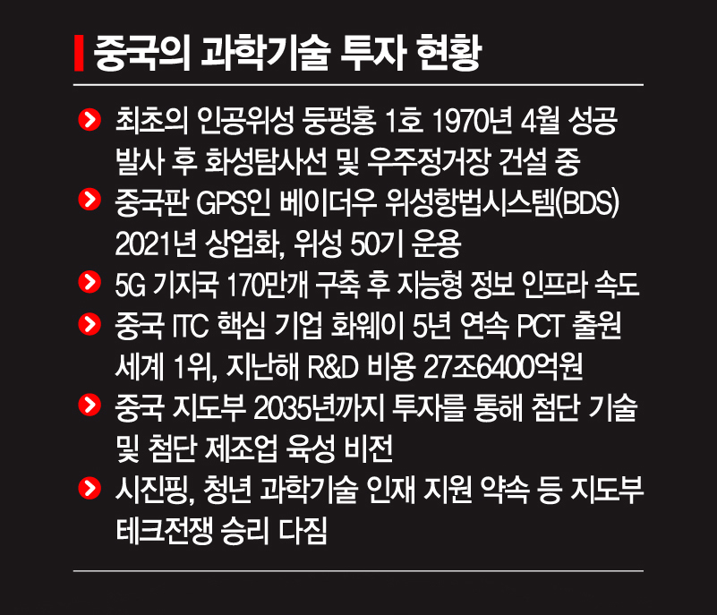 지난 2020년 10월 열린 중국 공산당 19기 중앙위원회 5차 전체회의(5중전회) 폐막 후 중국 지도부는 오는 2035년까지 지속적인 기술 투자를 통해 첨단 기술과 첨단 제조업을 육성하겠다는 청사진을 공개했다. 중국의 과학기술 강국 건설은 내수 중심의 경제 성장 전략인 쌍순환 정책에 가려 잘 드러나지 않았지만 중국 지도부는 첨단 기술 확보 등 질적 발전을 이끌겠다는 의지를 분명히 했다. 테크전쟁에서 승리, 강국 반열에 오르겠다는 게 중국 지도부의 중장기 전략이다.