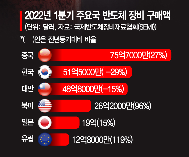 EU의 반도체법 통과 전후로 유럽국가들과 기업들의 반도체 제조분야 투자 열기는 크게 달아오르고 있다. 국제반도체장비재료협회(SEMI)가 지난 2일 집계한 반도체 장비시장 통계 보고서에서 올해 1분기 유럽의 반도체 장비 수입액은 12억8000만달러로 전년 동기 대비 119%나 급증했다. 수입액 규모 자체는 중국(75억8000만달러), 한국(51억5000만달러), 대만(48만8000만달러) 등 아시아 국가들에 아직 한참 못 미치지만, 앞으로 가파른 성장세가 예상되고 있다.