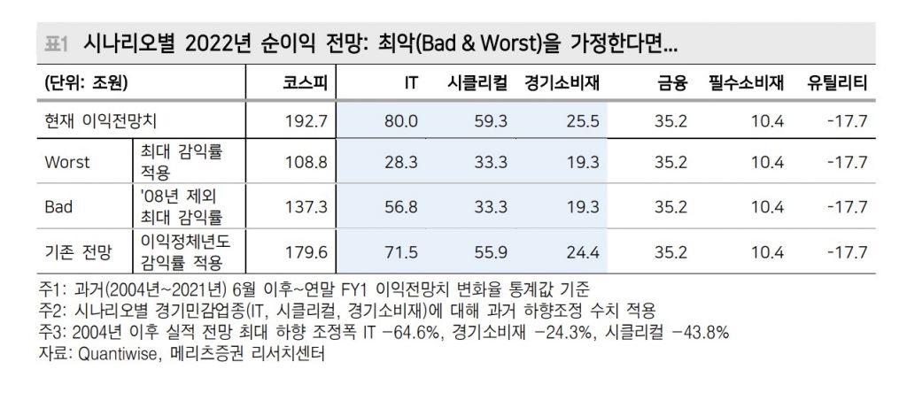 금융위기를 포함한 수준의 최대 감익률을 적용(금융부실과 같은 2차 충격은 배제)한다면 109조원 수준까지 실적 전망이 하향 조정된다. 반도체가 포함된 IT 업종의 실적전망이 현재 80조원에서 28조원으로 급감한다는 가정이 포함된 수치다.