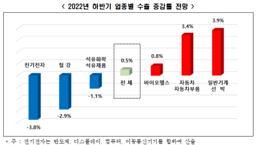 ▲전기전자(-3.8%), ▲철강(-2.9%), ▲석유화학?석유제품(-1.1%) 업종은 올해 하반기 수출이 전년 동기 대비 감소할 것이라고 전망했다. 반면 ▲바이오헬스(+0.8%), ▲자동차?자동차부품(+3.4%), ▲일반기계?선박(+3.9%) 업종은 올해 하반기 수출이 증가할 것으로 내다봤다.