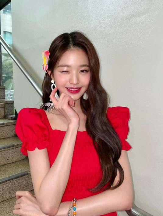 사진 속 장원영은 빨간 드레스를 입고 카메라 앞에서 포즈를 취하고 있다.