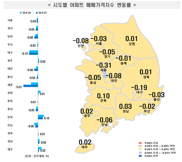 한국부동산원이 6월 30일 발표한 '6월 4주 주간 아파트 가격동향' 자료에 따르면, 서울 아파트값은 지난주에 이어 0.03% 하락했다.