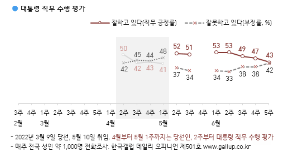 6월1째주와 2째주 윤 대통령 국정수행 지지율이 53%를 기록한 것을 고려하면 한 달 사이에 지지율이 10%포인트 하락한 것이다.