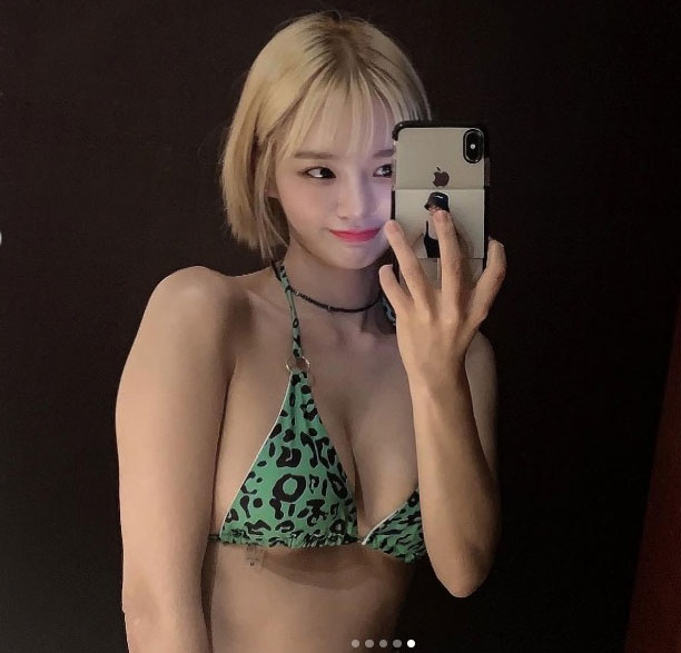 공개된 사진 속 맹승지는 표범 무늬 비키니를 입고 거울 앞에서 포즈를 취하고 있다.