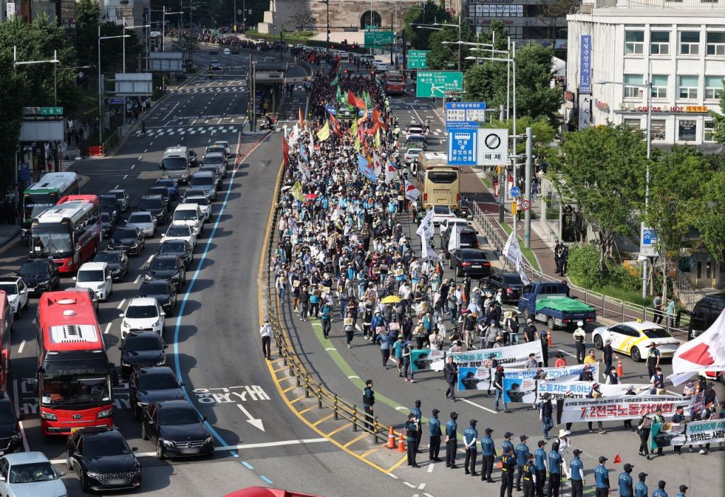 민주노총은 이날 서울 중구 세종대로와 서울시청 앞 광장 일대에서 6만여명(경찰 추산 5만여명)이 참여한 가운데 전국노동자대회를 열고 이번 최저임금 인상률은 사실상 삭감 수준이라고 주장했다. 양경수 민주노총 위원장은 "IMF라고, 금융위기라고, 코로나19 위기라고 우리에게 허리띠 졸라 매라 강요했다"며 "임대료는 2~3배 뛰고 가맹수수료는 재벌의 최대 이익을 보장하는데 460원 오른 최저임금이 고통의 원인이라고 한다"고 말했다.