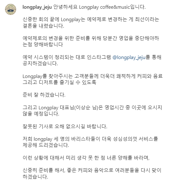 롱플레이 측은 또 "예약제로의 변경을 위한 준비를 위해 당분간 영업을 중단해야 하는 점 양해바란다"고 추가로 공지했다.