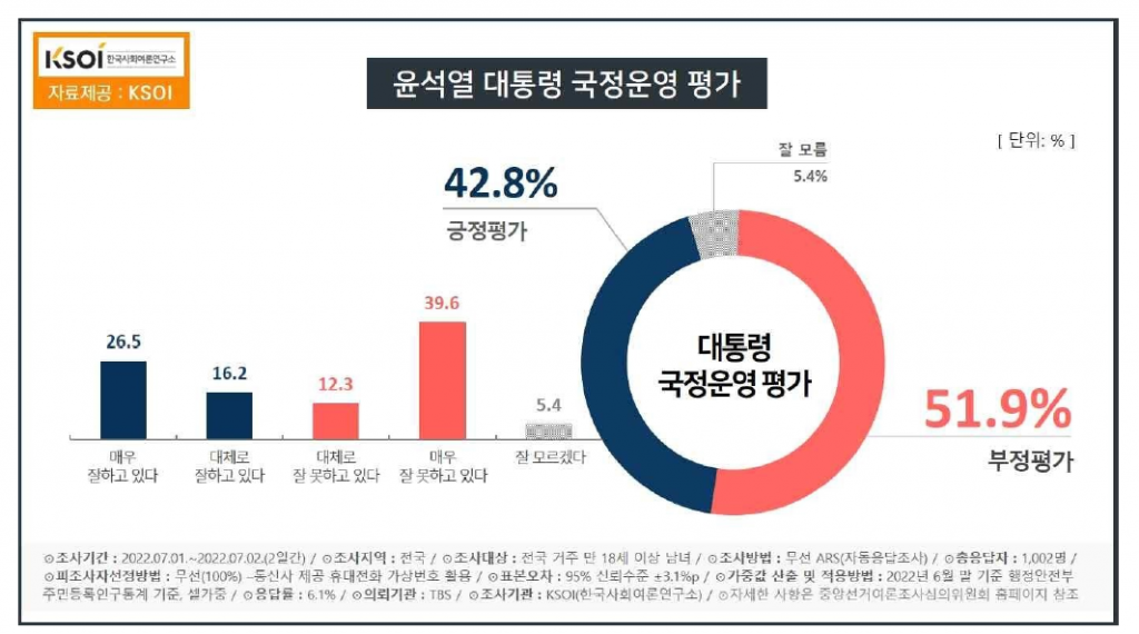 4일 TBS 의뢰로 한국사회여론연구소(KSOI)가 진행한 여론조사(1~2일 전국 만 18세 이상 성인남녀 1002명 대상으로 무선 ARS 방식 진행)에 따르면 윤 대통령의 국정에 대한 긍정평가는 42.8%, 부정평가는 51.9%로 조사됐다. 지난주 이 조사에서 데드크로스가 발생해 긍정평가보다 부정평가가 0.6% 높았는데, 이번에는 그 격차가 9.1%포인트까지 넓혀졌다.