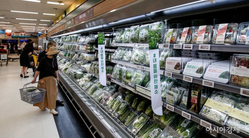최근 폭우와 함께 찾아온 장마로 채소값이 급등하고 있는 3일 서울 한 대형마트를 찾은 고객들이 장을 보고 있다./강진형 기자aymsdream@