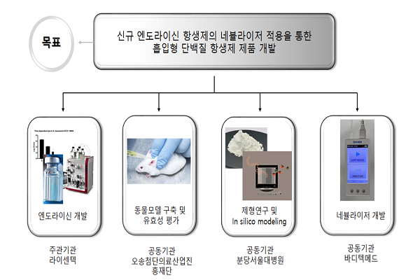 라이센텍은 항균 능력을 가진 신규 엔도라이신 항생제를 연구하고 분당서울대병원과 시드니대는 네뷸라이저에 맞는 최적의 제형을 개발하며, 오송첨단의료센터는 동물모델링 구축과 유효성 평가를 담당한다.