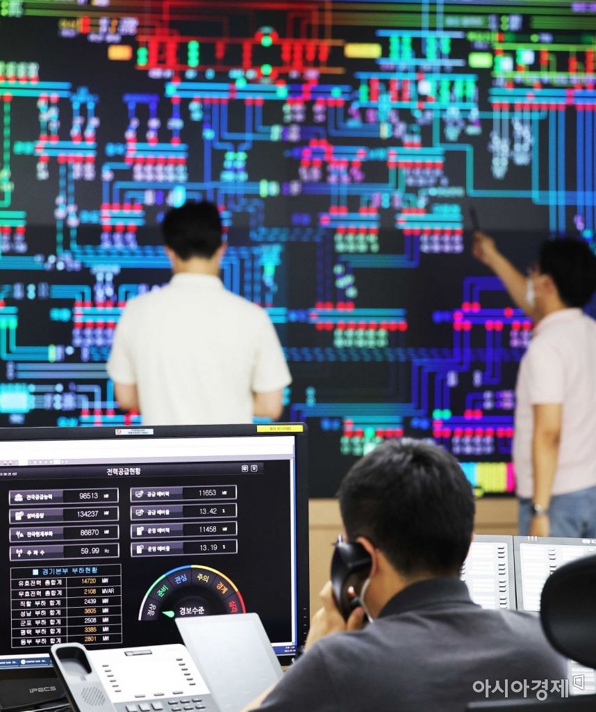 폭염이 기승을 부리며 전기 사용량이 급증하고 있는 4일 수원특례시 한국전력공사 경기지역본부 전력관리처 계통운영센터에서 관계자들이 전력 수급 상황을 점검하고 있다./수원=강진형 기자aymsdream@