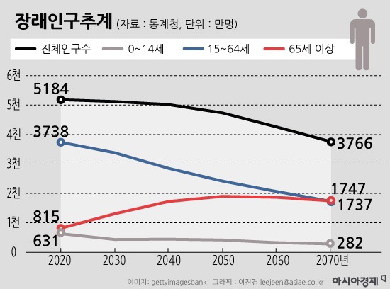 눈여겨볼 지표는 생산연령인구와 고령인구다. 2020년과 2070년 연령별 인구 구성비를 보면 15~64세 생산연령인구 비중은 72.1%에서 46.1%로 뚝 떨어지는 반면 65세 이상 고령인구 비중은 15.7%에서 46.4%로 크게 늘어난다. 50년 뒤면 총인구에서 생산연령인구와 고령인구가 차지하는 비중이 엇비슷한 수준으로 대한민국이 ‘늙는’ 것이다. 현재 3700만명대인 생산연령인구는 2070년 1700만명대로 급감할 것으로 보인다. 고령인구는 2024년 1000만명을 돌파해 2070년에는 1750만명까지 늘어날 전망이다. 추계대로라면 중위연령은 2020년 43.7세에서 2031년 50세를 넘고 2070년 62.2세까지 늘어난다.