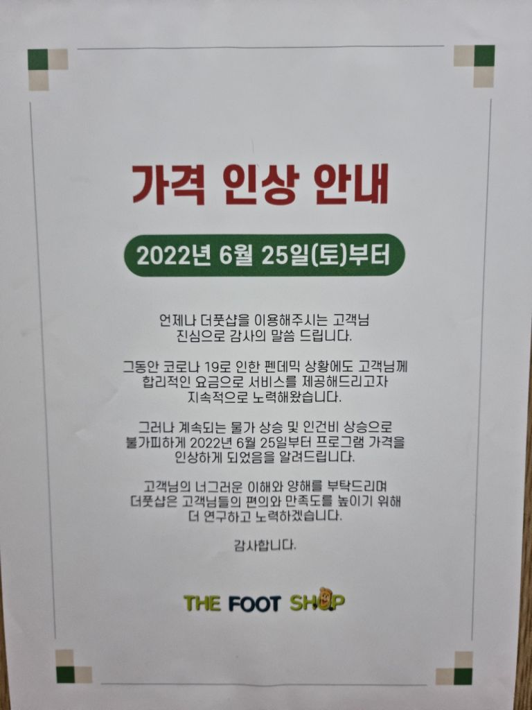 마사지 프랜차이즈 업체인 ‘더풋샵’ 합정역점에 가격인상 안내문이 붙어있다. 사진=아시아경제 문혜원