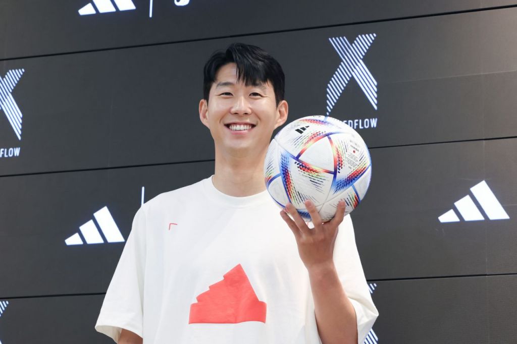 손흥민이 지난 4일 오전 서울 마포구 아디다스 홍대 브랜드 센터에서 열린 '손 커밍 데이' 행사에서 2022 카타르 월드컵 공인구와 함께 포즈를 취하고 있다. [이미지출처=연합뉴스]