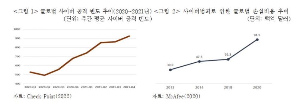 사이버보안 솔루션 기업 체크 포인트 소프트웨어(Check Point Software)에 따르면 전 세계적으로 코로나19 확산이 본격화된 2020년 중반부터 글로벌 사이버 공격 빈도가 증가세를 보였으며, 2020년 상반기 500건 수준에 머물던 한 기관당 주간 평균 사이버 공격 빈도는 2021년 4분기 925건으로 대폭 증가했다.