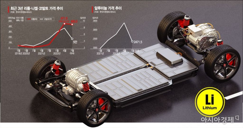 반면 니켈·코발트 등 다른 배터리 소재들은 러시아와 우크라이나 전쟁 이후 급등한 가격이 현격히 떨어지는 추세다. 가장 비싼 코발트의 경우, 지난 4월까지 t당 8만1600달러(약 1억573만원)에서 현재 5만달러(약6480만)까지 약 38% 가량 하락했다. 니켈 역시 같은 기간 3만2800달러(약 4250만원)에서 2만2000달러(약 2851만)로 32% 내려갔다.
