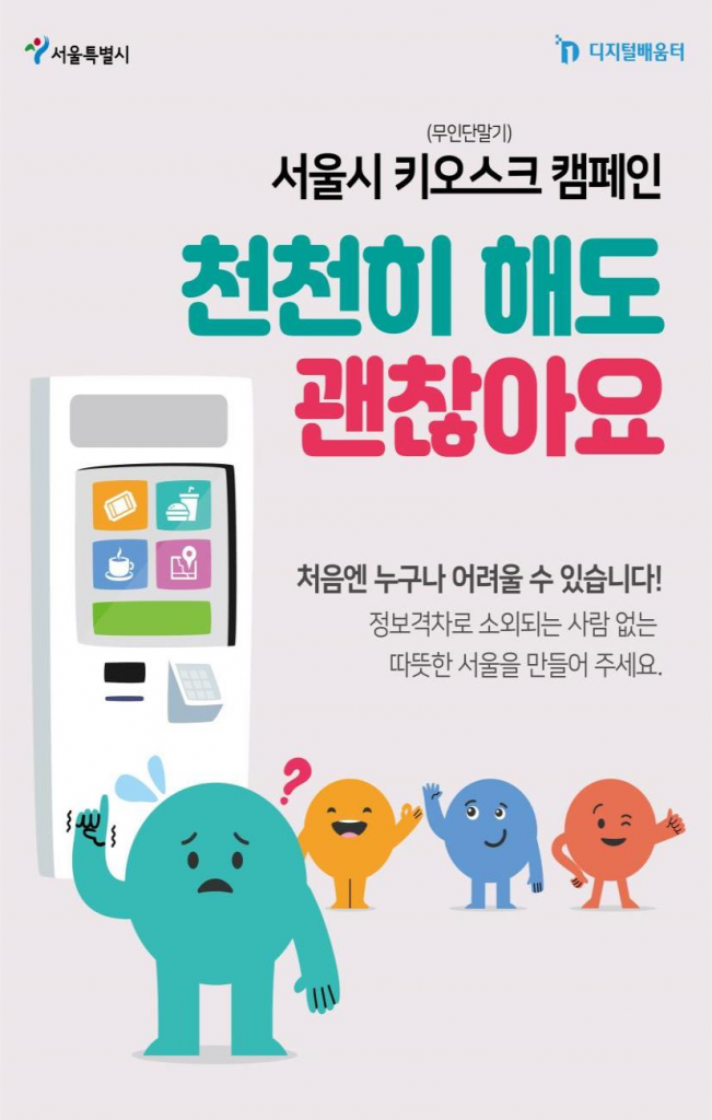 무인단말기(키오스크) 사용에 어려움을 겪는 모두를 배려하자는 공감대를 확산하기 위한 대시민 캠페인 ‘천천히 해도 괜찮아요’를 연말까지 펼친다. 롯데 세븐일레븐의 편의점 디지털 매체, KBS 미디어 전광판, 지하철역 미디어보드 등 협의체에 참여하는 기관의 다양한 홍보매체를 활용함으로써 서울을 넘어 전국적 확산을 도모한다.