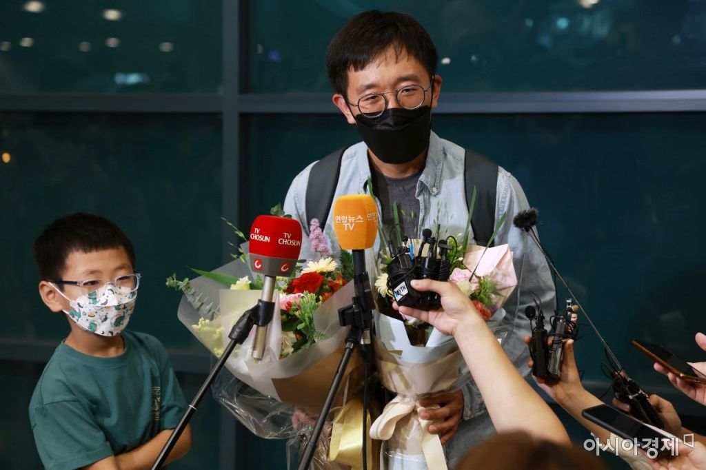 필즈상을 수상한 허준이 미국 프린스턴대 교수 겸 한국 고등과학원 수학부 석학교수가 8일 인천국제공항 제1여객터미널을 통해 귀국해 취재진과 인터뷰하고 있다. /문호남 기자 munonam