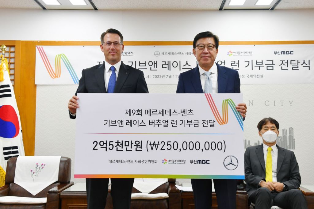 부산광역시청에서 열린 부산지역 수혜처에 대한 기부금 전달식에는 박형준 부산광역시 시장, 토마스 클라인 메르세데스-벤츠 사회공헌위원회 의장 및 구자중 부산MBC 대표이사, 이훈규 사회복지법인 아이들과미래재단 이사장이 참석했다.