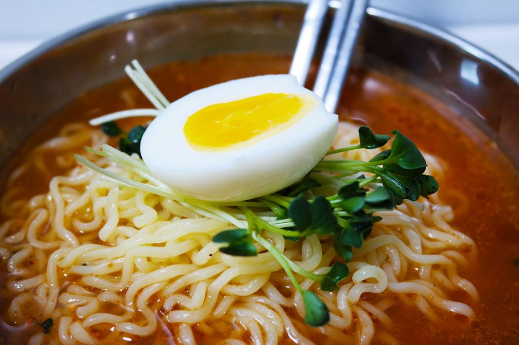 비빔라면, 냉면 육수, 삶은계란, 무순, 닭가슴살
