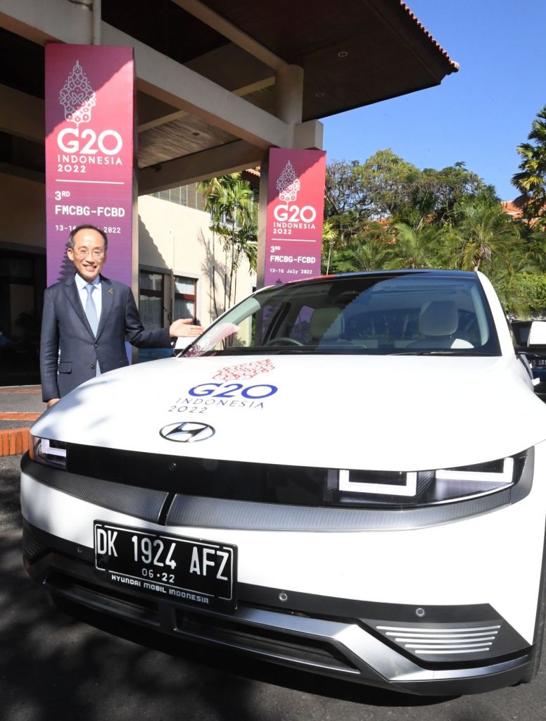 인도네시아 발리에서 열린 주요 20개국(G20) 재무장관·중앙은행 총재 회의에 참석 중인 추 부총리는 이날 오후 발리 누사두아 컨벤션센터(BNDCC)에서 현대차 인도네시아 현지 공장에서 생산한 아이오닉5를 둘러봤다. 추 부총리는 스리물랴니 안드라와티 인도네시아 재무장관과의 면담에 앞서 아이오닉5 홍보 차원에서 기념사진을 찍기도 했다. 인도네시아는 G20 정상회의 공식 의전차량으로 현대차의 제네시스 G80 전기차와 아이오닉5를 선정한 바 있다.