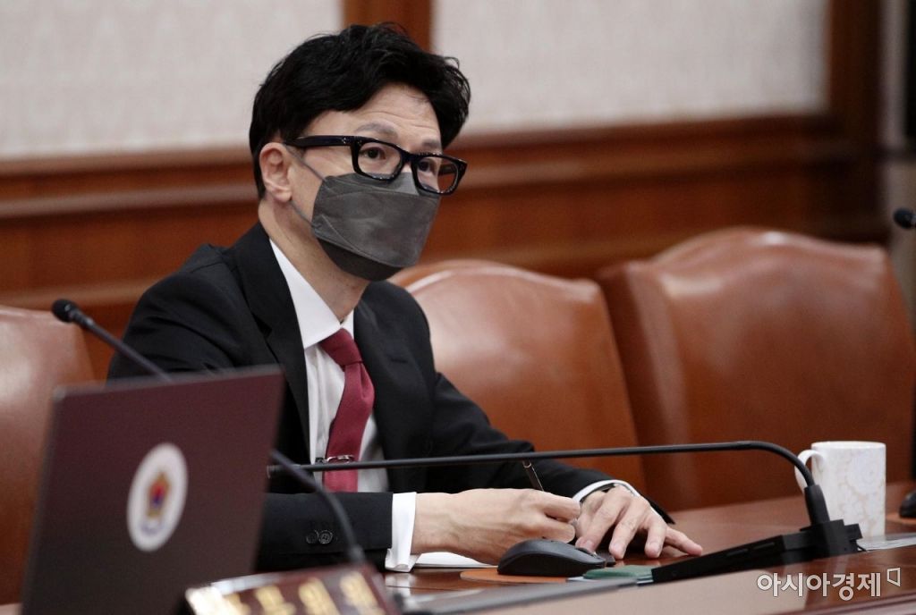 한동훈 법무부 장관이 14일 서울 종로구 정부서울청사에서 세종청사와 영상회의로 진행된 국무회의에서 한덕수 총리의 모두발언을 경청하고 있다./김현민 기자 kimhyun81@