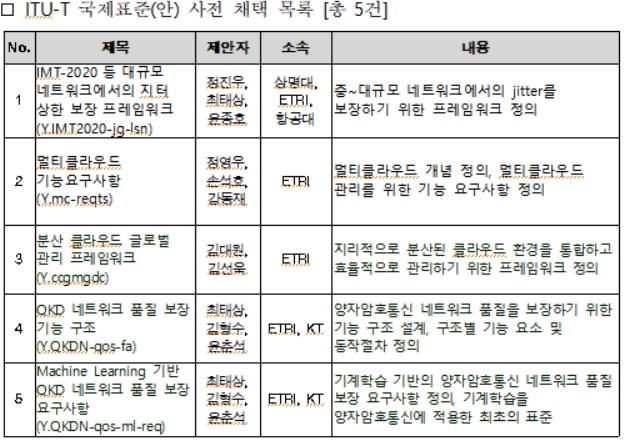 [아시아경제 임혜선 기자] 과학기술정보통신부 국립전파연구원은 15일까지 스위스 제네바에서 개최된 국제전기통신연합 전기통신표준화 부문(ITU-T) 미래네트워크 연구반(SG13) 회의에서 우리나라 주도로 개발한 5G, 클라우드컴퓨팅, 양자암호통신 분야의 관련한 국제표준(안) 5건이 사전 채택되고, SG13 국제의장단 11석을 확보했다고 18일 밝혔다.