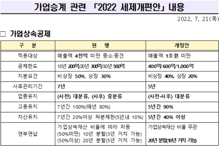 정부가 발표한 세법개정안에 따르면 가업상속공제를 활용한 기업의 사후관리기간은 7년에서 5년으로 단축된다. 고용 유지 요건은 7년간 100%에서 5년간 90%로, 자산 처분 제한율은 7년간 20%에서 5년간 40%로 완화됐다. 업종 유지 요건은 사전·사후 모두 제조업, 건설업 등과 같은 대분류 안에서 변경 가능토록 개편됐다.