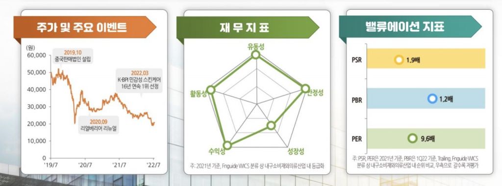 박선영 연구원은 "2022년 추정실적 기준 밸류에이션은 주가수익비율(PER) 8.7배, 주가순자산비율(PBR) 1.2배 수준으로 화장품 동종기업 밸류에이션 평균인 PER 18.0배, PBR 1.6배와 비교해 현 주가 수준은 저평가 구간"이라고 짚었다.