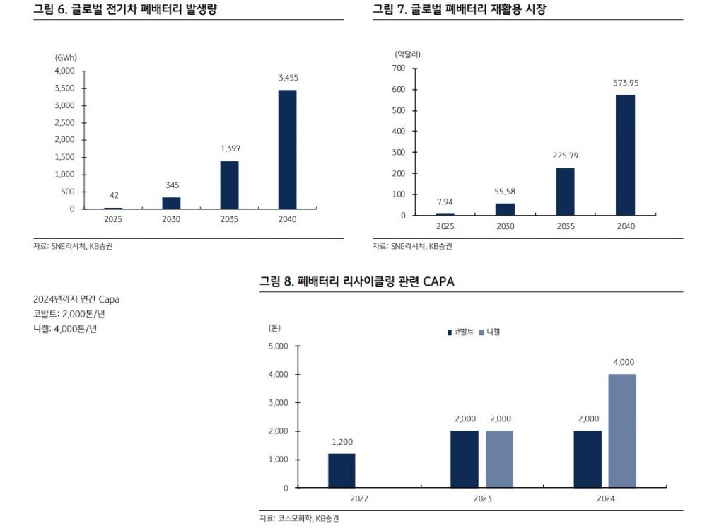 더불어 폐배터리 리사이클링 시장 개화에 주목한다. 코스모화학의 리사이클링 사업은 폐배터리로부터 니켈, 코발트 등을 추출해 자회사인 코스모신소재로 공급하는 구조이다. 2021년 300억원 규모의 사업투자 발표 후 2022년 6월 159억원의 탄산리튬 설비투자를 추가 발표했다.