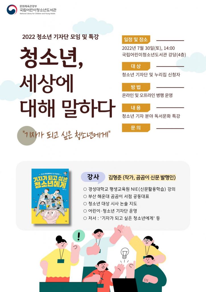 강사는 ‘기자가 되고 싶은 청소년에게’의 저자인 김형준 작가다. 김 작가는 어린이·청소년을 대상으로 20년 이상 기자단을 운영해 왔다. 강연과 문답을 통해 기사 취재활동과 작성법에 관해 대화를 나눌 예정이다.