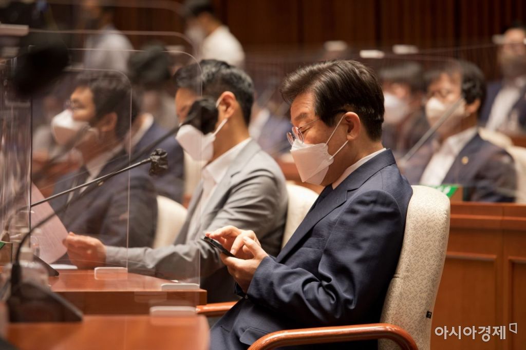 더불어민주당 대표에 출마한 이재명 의원이 22일 국회에서 열린 의원총회에 참석, 회의 도중 휴대폰을 확인하고 있다./윤동주 기자 doso7@