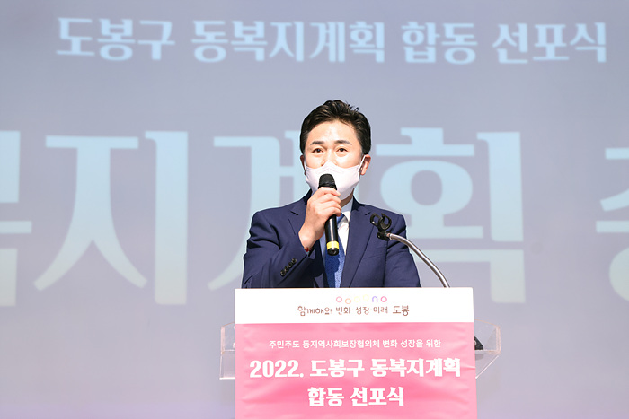 오언석 도봉구청장이 28일 열린 봉구 동복지계획 합동 선포식에서 축하 인사말을 전하고 있다.