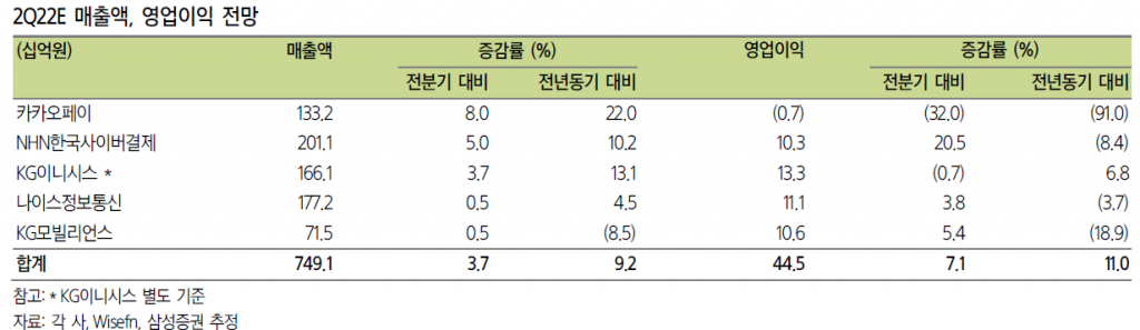 30일 삼성증권은 결제사들의 업황 전망에 대해 이 같이 내다봤다. 카카오페이, NHN한국사이버결제, 나이스정보통신, KG모빌리언스 등 주요 결제사들의 올해 2분기 실적은 주춤할 전망이다. 삼성증권은 KG이니시스를 제외하면 모두 전년 동기 대비 영업이익이 줄어들 것으로 예상했다. KG모빌리언스의 경우 매출도 전년 동기 대비 8.5% 감소할 것으로 내다봤다.