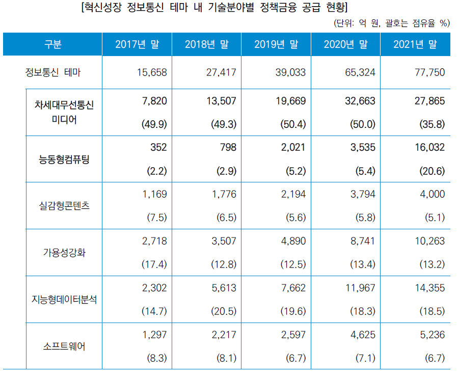 금액 규모로는 차세대무선통신 미디어 분야의 정책금융 공급액이 가장 컸다. 2017년 말 7820억원에서 지난해 말 2조7865억원으로 증가하는 등 5년 새 2조원 가량이 투입됐다. 오 선임조사역은 "5G 원천기술 및 국제표준 확보를 위한 정부의 강한 의지, 유무선 융합시장의 성장으로 인한 스마트 이동통신 시스템에 대한 수요 증가, 신흥국의 통신연계사업 발전으로 인한 해외시장 진출기회 확대 등으로 시장이 성장할 것으로 내다봤기 때문"이라고 설명했다.