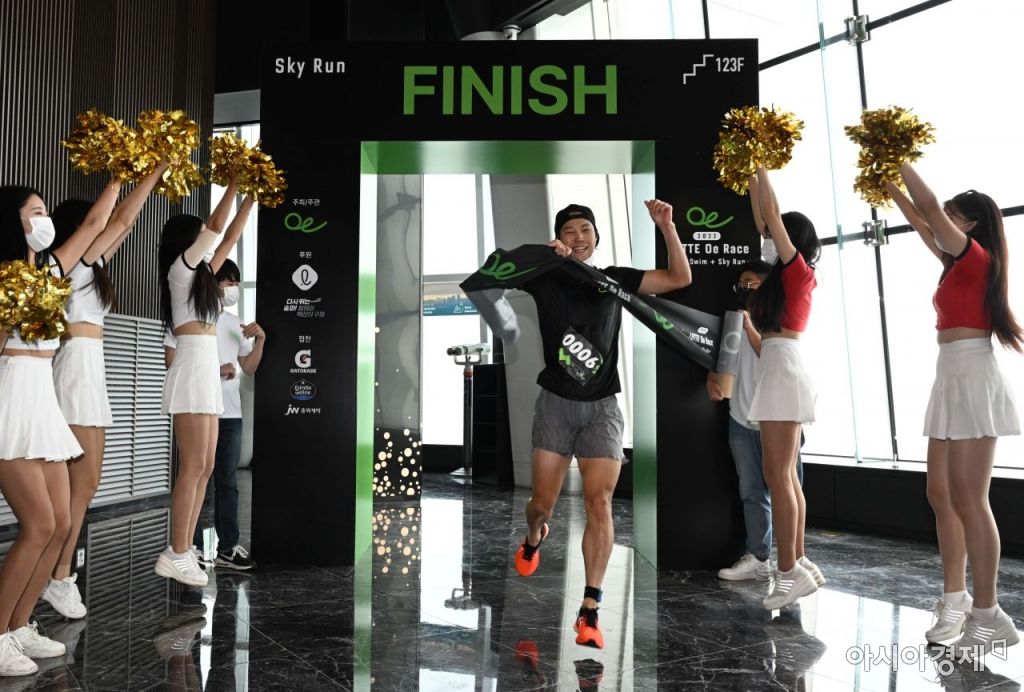 7일 서울 송파구 롯데월드타워 일대에서 열린 아쿠아슬론 대회 Oe Race에 출전한 최규서 씨가 첫 번째로 롯데월드타워 123층 결승선을 통과하고 있다. /문호남 기자 munonam@