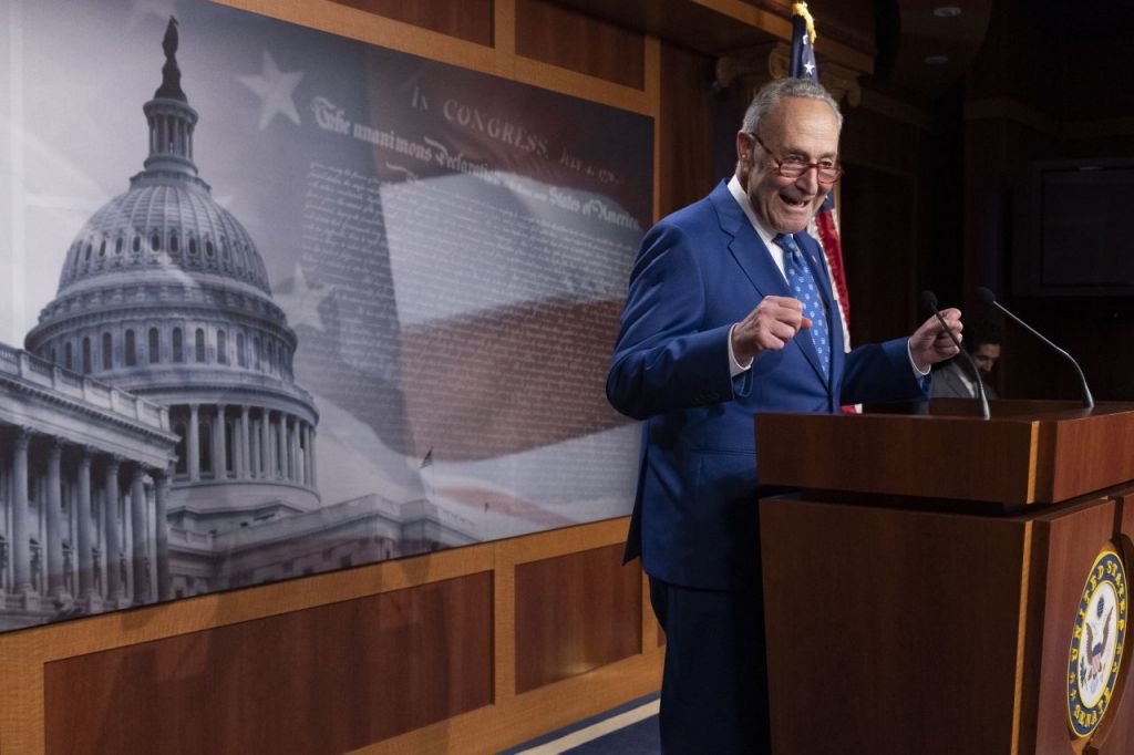 척 슈머 민주당 상원 원내대표가 7일(현지시간) 미 상원에서 인플레이션 감축 법안이 통과된 후 기자회견에 참석해 발언하고 있다. [이미지출처=EPA연합뉴스]