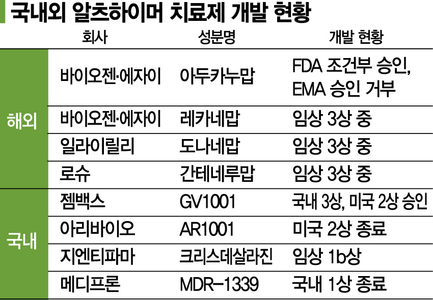 바이오젠·에자이가 공동 개발한 알츠하이머 치료제 아두헬름은 지난해 6월 사상 최초로 FDA의 치매 치료제 조건부 승인을 받았다. 하지만 12월 유럽의약품청(EMA)에서는 승인이 거부됐다. 임상적 개선을 확인하기 어렵고, 부작용 우려가 있다는 것이다. 한국 허가 역시 지난달 열린 중앙약사심의위원회 회의 결과 임상 3상을 ‘확증적 임상으로 판단하기에 충분치 않다’는 결론이 내려졌다. 이 자리에 참석한 한 위원은 "사용 시 아밀로이드베타(Aβ) 감소는 확인됐으나 치매치료 효과와는 무용성으로 판정될 정도로 미미한 결과"라고 말했다.