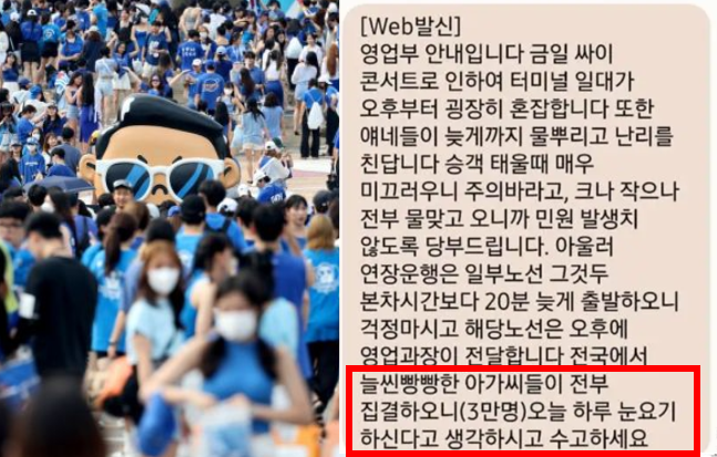 8일 한 온라인 커뮤니티에 여수의 한 버스회사가 흠뻑쇼 당일인 지난 6일 오전 회사 소속 운전원 180명에게 보낸 문자메시지가 공개됐다.