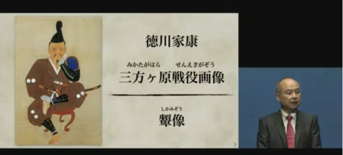 손정의 소프트뱅크 회장(오른쪽)이 8일 실적 발표 중 도쿠가와 이에야스의 초상화를 화면에 띄우고 발언하고 있다. (사진출처=니혼게이자이신문)