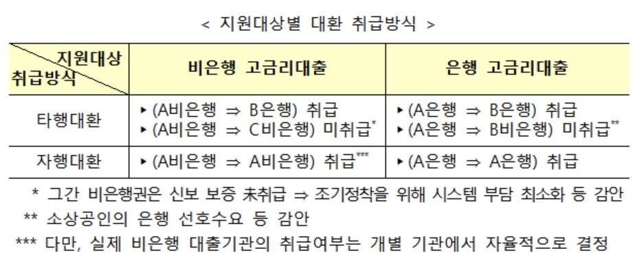이번 대환 프로그램은 코로나19로 어려움을 겪은 자영업자·소상공인의 경영정상화를 지원하는 차원에서 원칙적으로 사업자대출(신용, 담보)을 대환대상으로 한다. 이에 주택·승용차 구입, 카드론·현금서비스, 사업목적 대출로 판단하기 어렵거나 대출성격상 대환이 적절하지 않은 경우에는 사업자대출로 취급됐더라도 대환대상에서 제외된다. 다만 화물차, 건설기계 등 상용차와 관련한 대출(할부 포함)은 사업목적 대출이 명확하다는 점에서 최초에 가계대출로 취급됐더라도 대환대상에 포함시킬 계획이다.